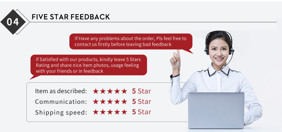 (1) If you feel satisfied with our products,pls give us a good feedback with all 5 stars,your support is the biggest motivate to us.